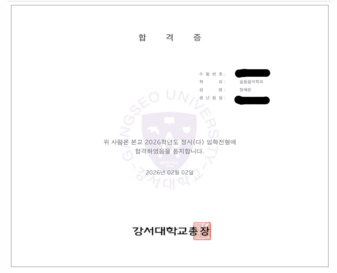 [입시합격자] 2026년도 강서대학교 정시 실용음악과 피아노 장O은 합격을 축하합니다!