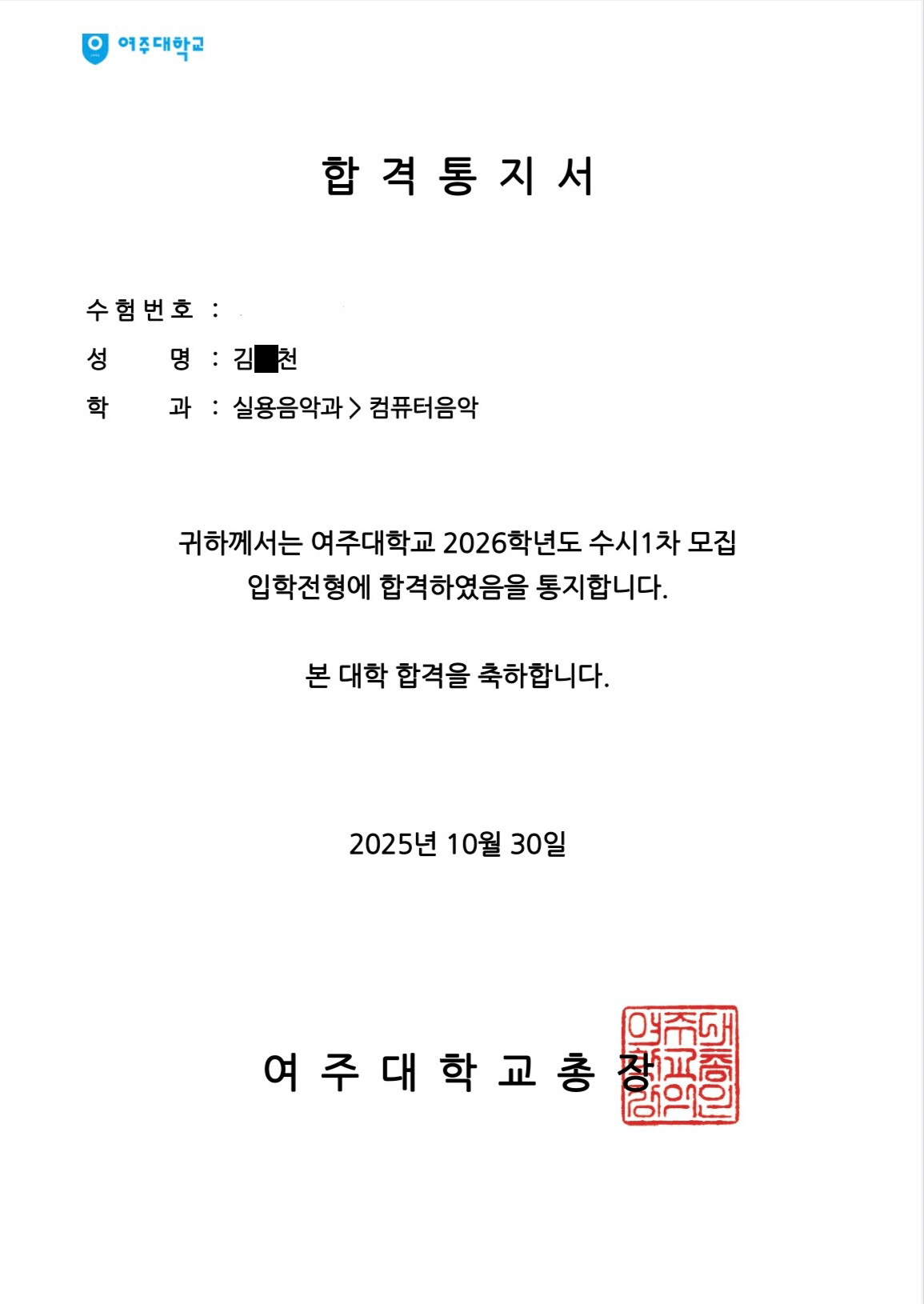 [입시합격자] 2026년도 여주대학교 수시 실용음악과 미디 전공 김O천 학생 합격을 축하합니다