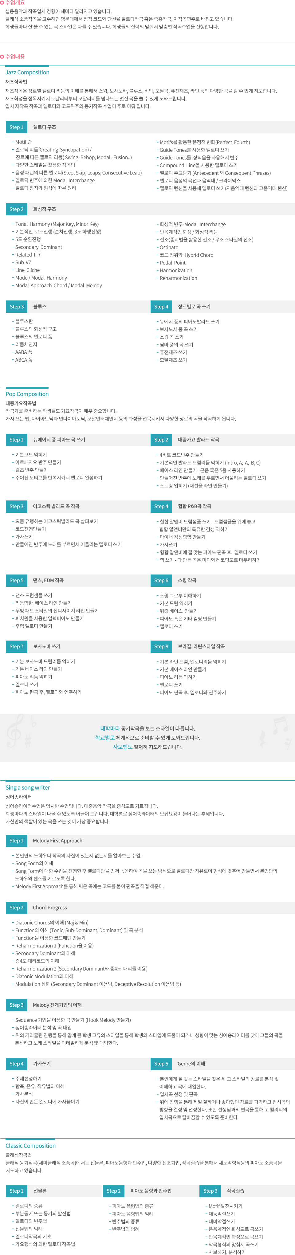 동기작곡, 가요작곡, 재즈작곡, 즉흥작곡으로 나뉩니다.
