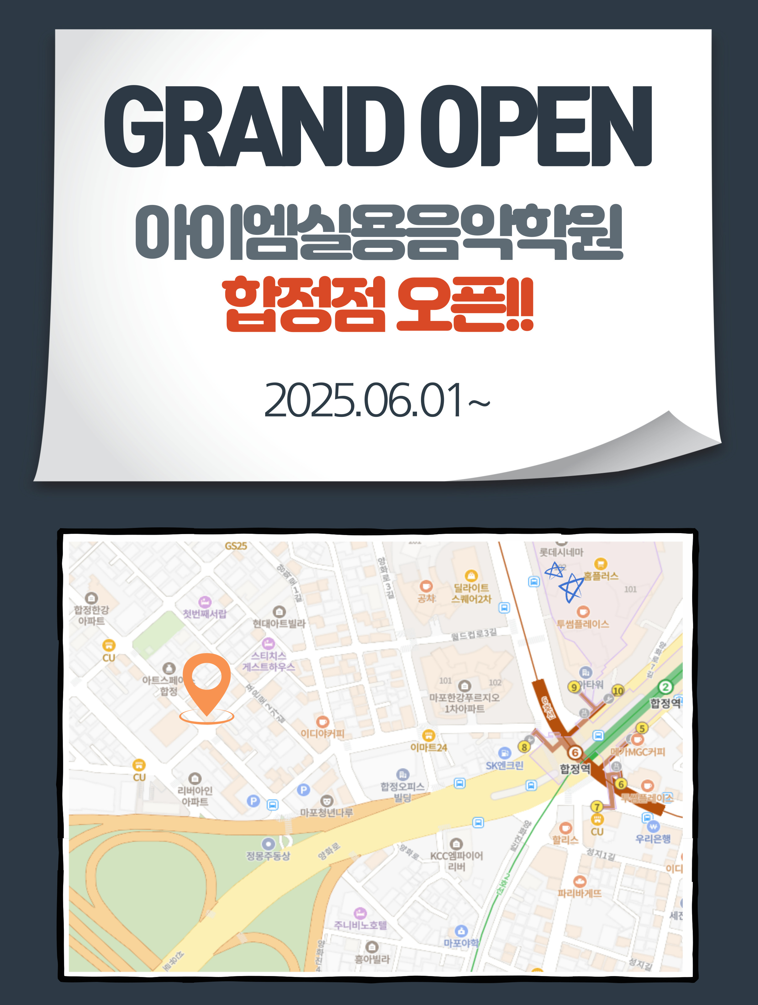 아이엠실용음악학원 합정점이 6월 1일부터 오픈됩니다!