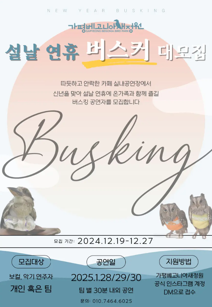 공휴일 관람객 평균 수 1,000명에 달하는 '가평베고니아새정원'에서 설연휴 버스킹 공연자를 모집합니다.